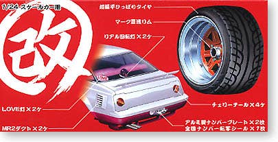 This car modification set includes rubber tires, chrome rims, 2 aluminum license plates, "cherry" taillights, quarter panel ducts, and decals to recreate any Japanese license plate.