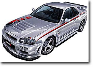 The stylish Nismo Skyline GT-R is beautifully rendered by Aoshima in this slick curbside kit. Molded in dark silver, with a black interior; translucent red and orange parts are included for indicators. Very sharp chromed parts are included for brake disks, reflectors, muffler, etc. Wheels are matte chrome. Excellent moldings are enhanced by a sheet of fine decals for dashboard, license plate, and exterior markings; several different markings are included to allow you some room for customising the final look.