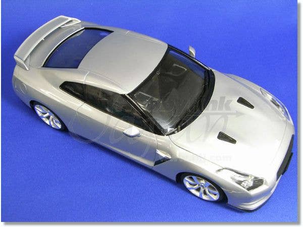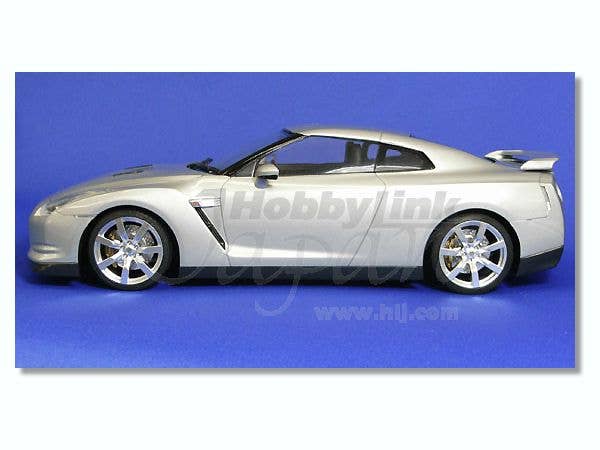 Not to be outdone by the fantastic GT-R kits of Tamiya and Fujimi, Aoshima's kit of the Nissan GT-R R35 Premium Edition features excellent molding and fantastic detail inside and out! The dynamic body is molded in white, with a black interior and chassis, and chrome detail parts. The tires are realistically rendered in black rubber, and the rims are gunmetal-colored. The suspension is nice and bouncy, with metal springs providing the jounce. Tail lamps are clear red. Front wheels are positionable after assembly. The hood is a separate part, but no engine or engine compartment detail is provided. Decals are included for the instrument panel, license plates, emblems, and more. All in all, another great contender in this year's heated battle of the GT-Rs! (Check out Aoshima's "standard GT-R" version, too, linked below.)