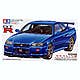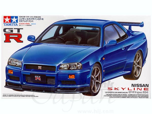 Tamiya's version of the 1999 Skyline GT-R, the latest in Nissan's immortal line-up of unbeatable sports machines carrying the Skyline name. Complete underside and interior detail, but there's no engine. Rubber wheels turn and steer after completion. Includes window masking stickers for easy painting. Typical Tamiya quality all-around.