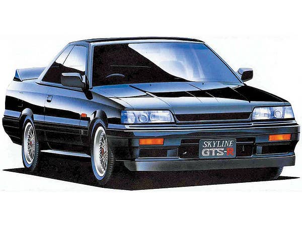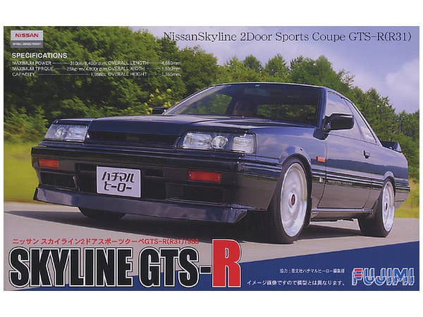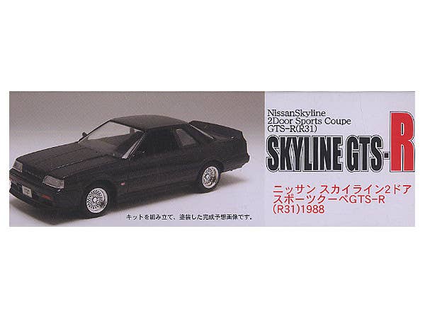 A very nice curb-side (no engine detail) kit of the R31 Skyline GTS-R. Body molded in black; interior also molded in black. Matte chrome rims. Decals included for interior (dash) and exterior markings. Originally a motorized kit, so the interior is a little funky to accommodate the batteries (this kit does not included any of the motorization gear).