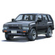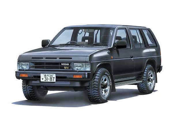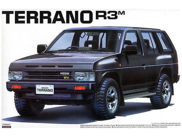 Aoshima's kit of the 1991 Nissan Terrano R3M features a body molded in black with gray interior and black chassis parts. Wheels are nicely rendered in a matte chrome finish, with big rubber tires. Decals are provided for the dash, license plates, and other details. Can be built as either a left- or right-hand-drive vehicle. A curbside kit, with no engine detail. Front wheels are positionable.