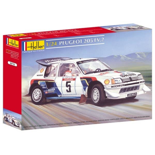 Standard-type plastic kit from Heller of the Peugeot 205 as seen in the 1985 Tour of Corsica rally. Interior roll cage, etc. are present, but relatively simple. Compared to Japanese offerings, Heller's kits are generally softer and with significantly less detail. They've correctly captured the overall look and feel of the subject matter, however.