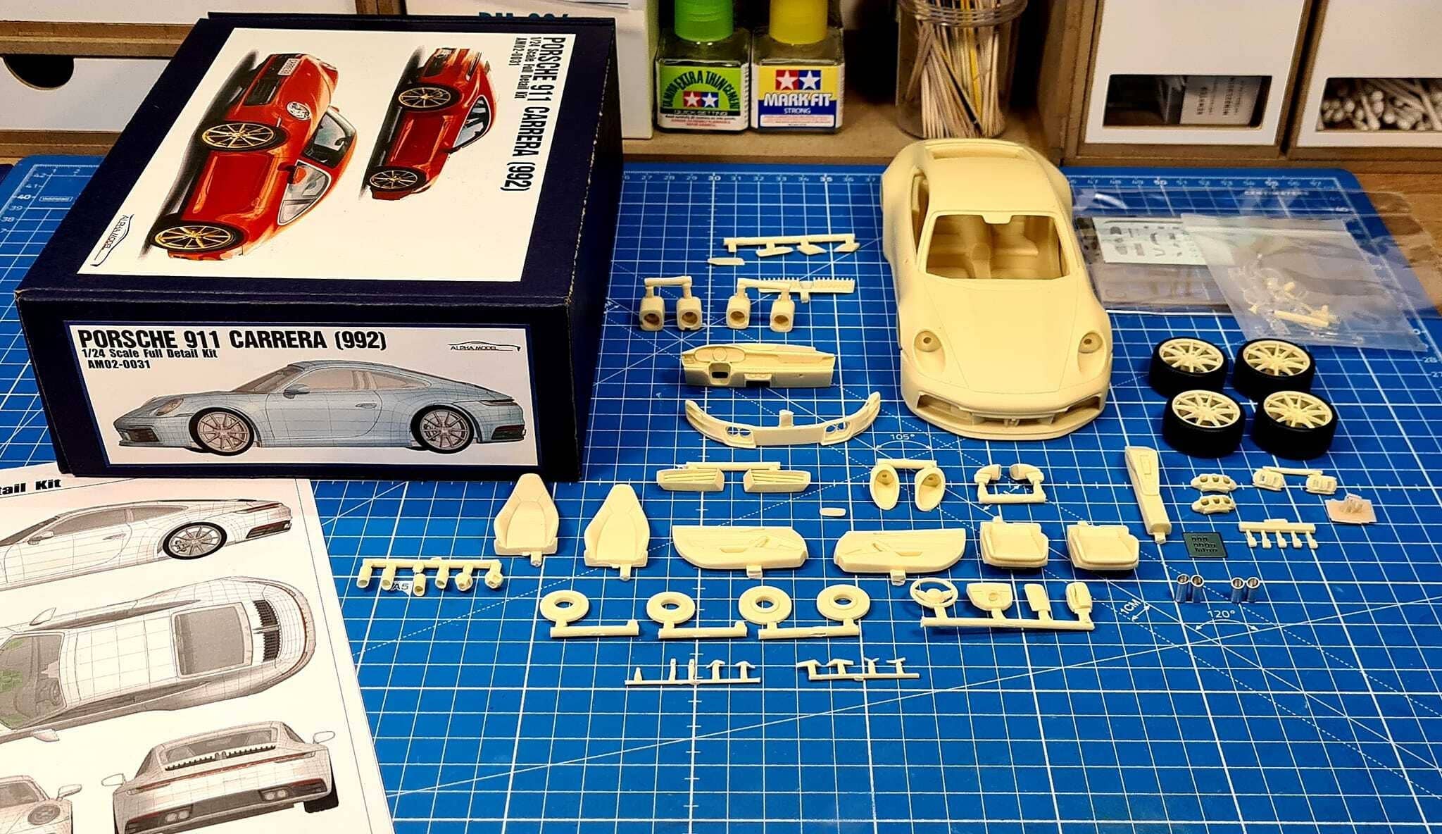 This is a car model kit assembled from parts made of resin, white metal, photo-etched metal and possibly other materials.