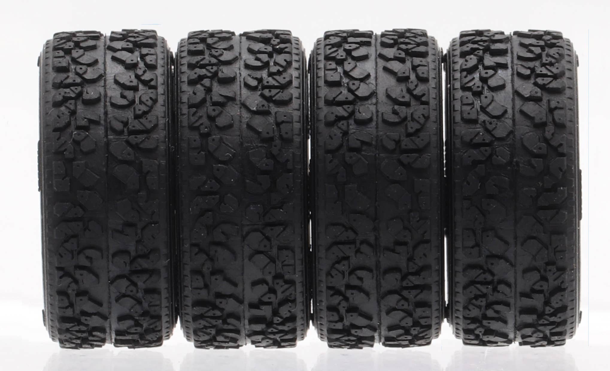 This is a set of plastic or metal wheels and rubber-like tires for detailing car models.