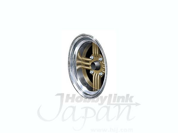 A set of four two-piece metal wheels with four rubber tires, with polycaps to aid in installation.