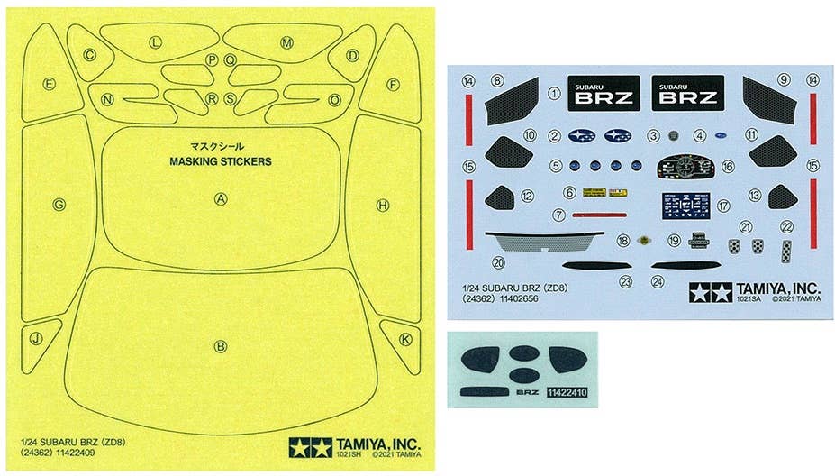 This new model kit from Tamiya reproces the BRZ's stylish and dynamic form, such as the voluminous rear fender, spoiler-shaped side sill, and ducktail at the rear of the trunk lid, just as it is on the actual vehicle! The air inlets on both sides of the bumper, including the roof side molding, and the outlets at the rear of the front fender have been made into separate parts, eliminating the need for masking. The horizontally-opposed four-cylinder engine also includes auxiliary equipment such as batteries, fuse boxes and radiators. The hood can be opened and closed; it can be held open with a stay (made of resin) similar to that of the actual vehicle. The front and rear suspensions have a three-dimensional finish while reducing the number of parts; inlet marks are available on the door mirrors and rearview mirrors. The rear combination lamp case, backlight case, and muffler end are plated; sharp 10-spoke design wheels are fitted with textured solid rubber tires. The sporty intertior, with its horizontal dashboard, ABC pedals, MT shift knobs, and lever-type side brakes is also a highlight. The roof molding is a separate part to reduce masking time and effort. Order this spectacular kit of a groundbreaking new car for your own collection today!