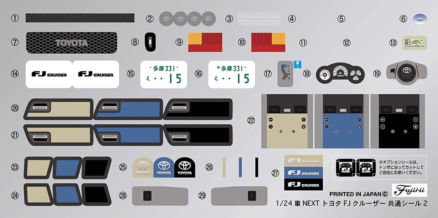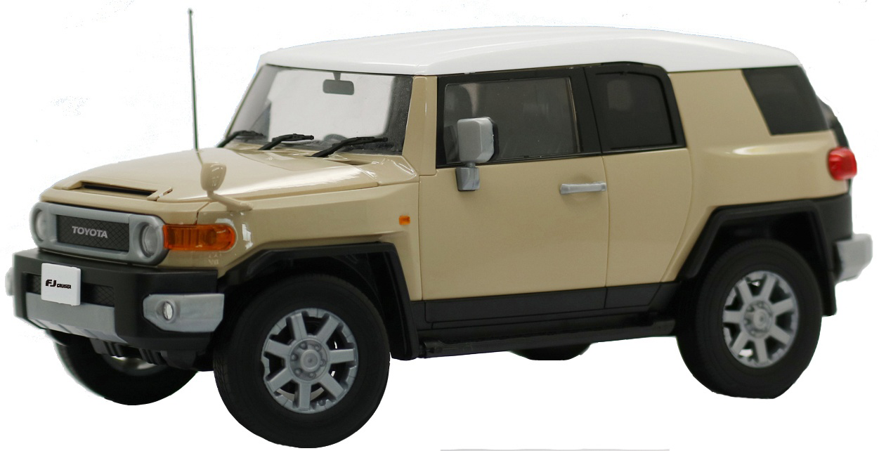 The Toyota FJ Cruiser mid-size SUV is represented in this "Car Next" model kit from Fujimi! This kit snaps together so glue is not needed, and it's molded in color so painting is also not necessary (although as with just about any model kit, it'll look even more amazing with some paint). Stickers are included for the mirrors, plate number, and other details, and the black shadow part of the window glass is equipped with a window film that can be used as window masking.