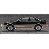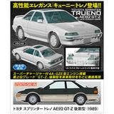 This top-of-the-line GT-Z late model of the Toyota Sprinter Trueno AE92, released in 1989, is thoroughly reproduced based on research conducted on the actual vehicle! This kit adds numerous new parts based on the Levin. Features include an optional moonroof (sunroof), selectable aluminum and normal wheels, and retractable headlights that can be opened and closed. The headlight and taillight mirrors, small lamp/fog lamp mirrors, and aluminum and normal wheels are all chrome-plated parts. Window masking stickers are included as well.