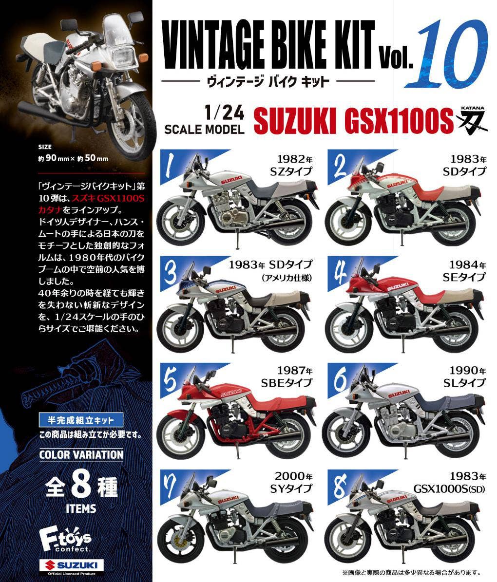 This is a series of gashapon (capsule toys) or trading figures depicting motorcycles.