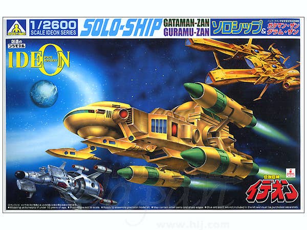 Only 500 made! This very limited re-release is from Aoshima's long-dormant "Ideon" line, featuring mecha from the 1980 anime series Yoshiyuki Tomino created immediately after "Gundam"! This set gathers injection kits, molded in yellow, gold, and white parts, of not only the Solo Ship and battleships Gataman-Zan and Guramu-Zan, but also an Ideon designed to ride on the Solo Ship, and a non-scale figure of series protagonist Cosmo Yuki. Cement and paint will be needed to complete the kits; assembly instructions and painting guides are in Japanese but are well-illustrated. This set's packaging states in Japanese: "This kit was made over 20 years ago. Since it is an old kit, you may experience difficulty with some assemblies." However, a quick look in the box doesn't reveal anything problematic...the moldings are crisp, sharp, and flash-free. Invoke your contact with the world of "Ideon" today!