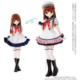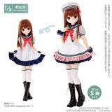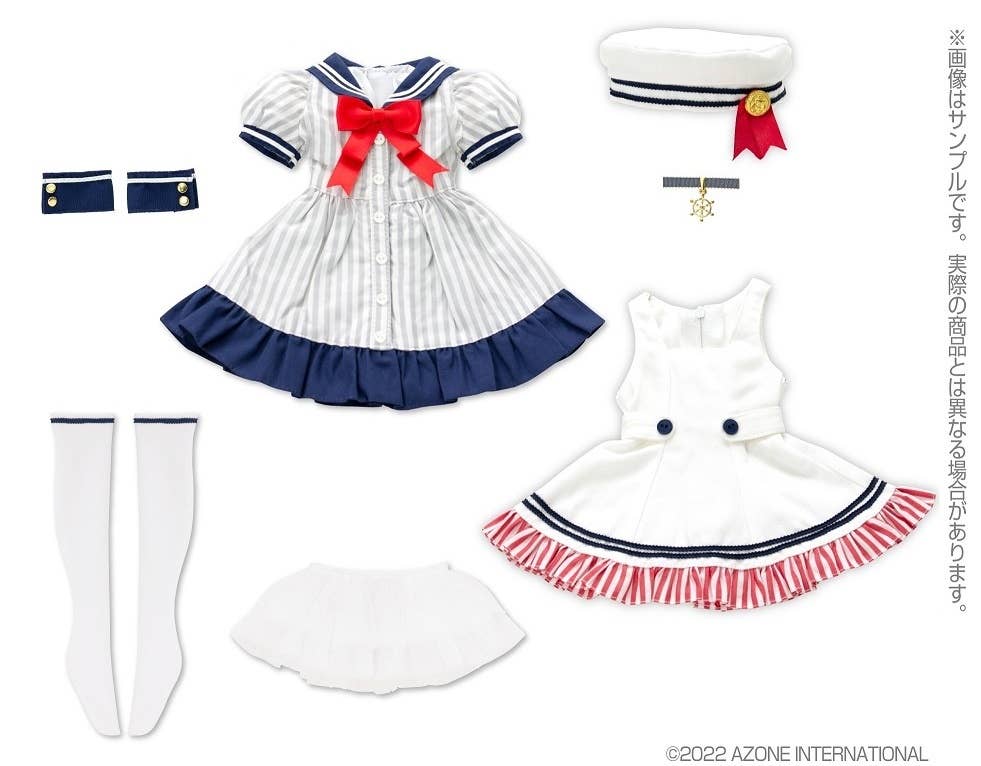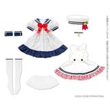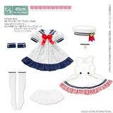 This super-sweet sailor one-piece set from Azone features a striped dress with a navy-blue ruffle at the hem that can be worn by itself, or with the jumper-style sleeveless dress over the top! An adorable beret, stockings, and wrist cuffs complete the outfit. Think how adorable your favorite 1/3-scale 45cm doll will look when she wears this costume -- order yours today!