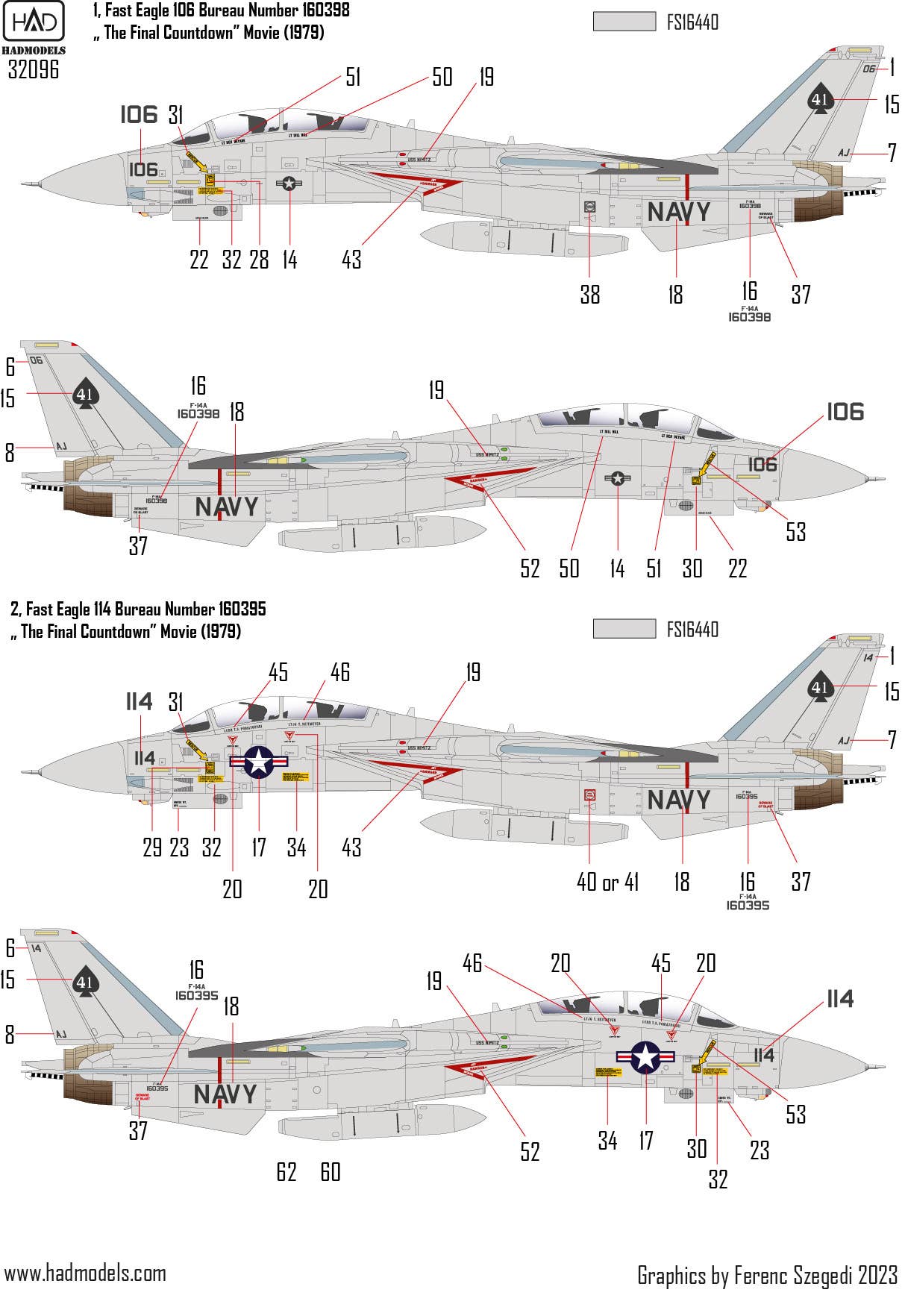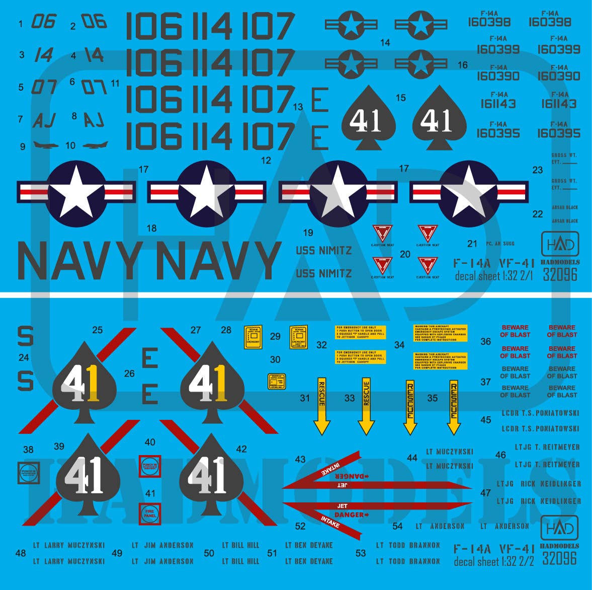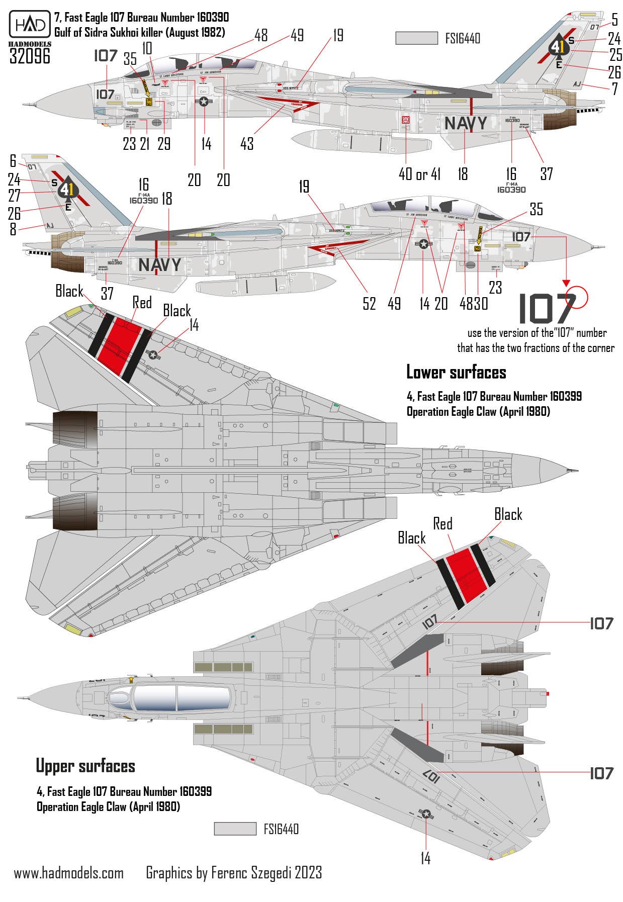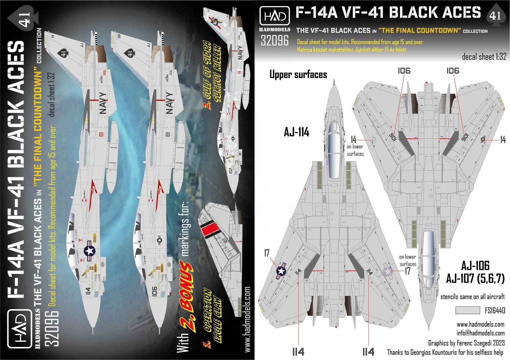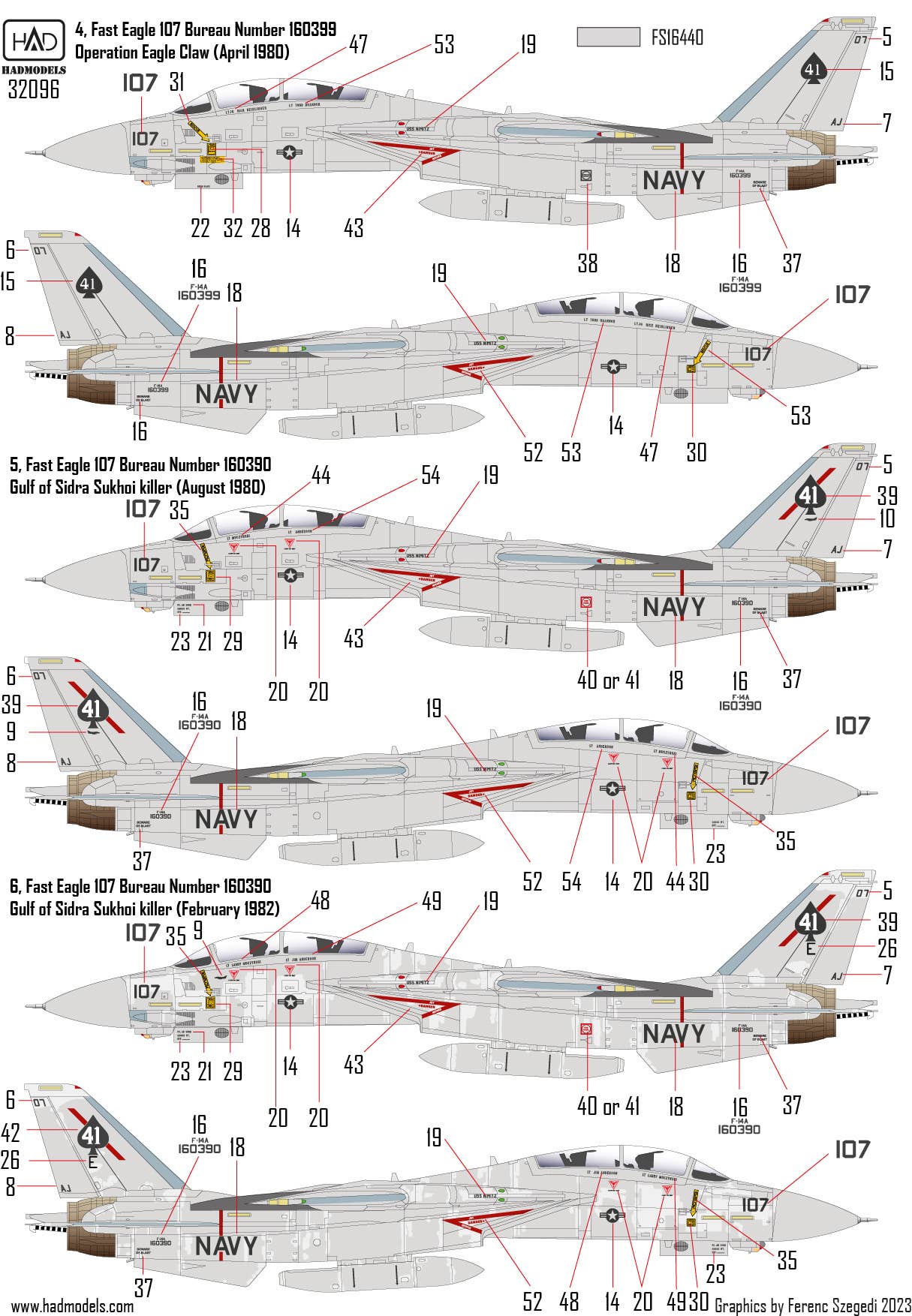 A total of seven VF-41 "Black Aces" markings are included, including those of the aircraft that participated in "Operation Eagle Claw" in 1980 and the aircraft that shot down a Libyan Su-22 in the "Gulf of Sidra Incident" in 1981.