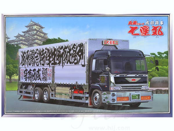 Known as dekotora (one of those very Japanese abbreviations that literally means "decorated truck"), vehicles like this are seen at auto and truck shows across Japan, not to mention driving down the road! A fairly big, complex kit with lots of small parts, including clear red and orange parts for the dozens of lights that adorn this sort of truck, and plenty of chrome. This truck represents a famous 11-ton long chassis reefer of the Marumi Group.
