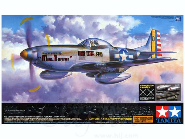This variation of the amazing Tamiya Mustang kit can be built as one of three versions: P-51D, P-51K, and the photo recon F-6D. Kit includes all the special parts needed to accurately build each version, and includes 4.5-inch M10 rocket tubes, 110 gallon drop tanks, 500 pound bombs, and a K24 camera. Includes decals for one P-51D, one P-51K, and one F-6D variation.