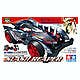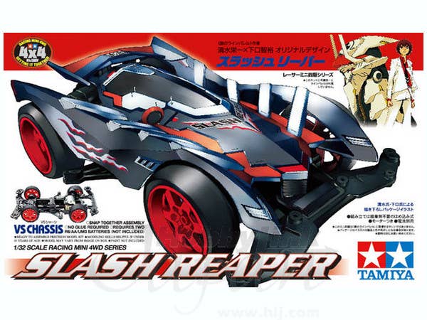 This is Tamiya's wild Mini 4WD Slash Reaper, with a black injection plastic body and rubber tires. Stickers are included for detail. Snap-fit assembly; no glue is required. Features a midship layout and three-piece chassis. A double shaft motor is included; two AA batteries are required but not included, and required tools (screwdriver, side cutters for plastic, and a modelling knife) are also not included. Mini 4WD cars are made for racing specifically on Tamiya racing circuits.