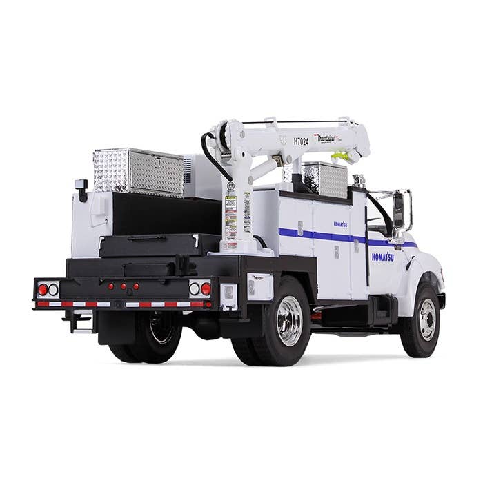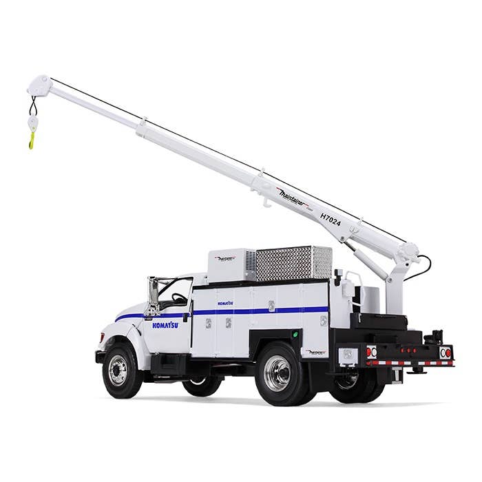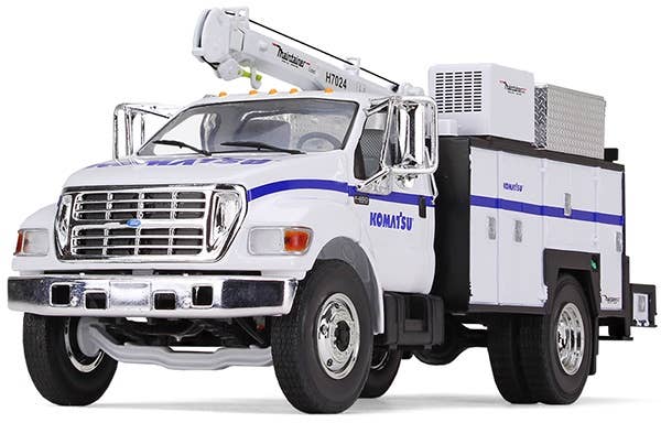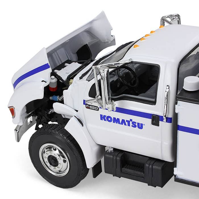 This completed die-cast model is of the Ford F-650 service truck in Komatsu livery. This is the seventh generation type that was produced until 2015. The hood can be opened to admire the detailed engine, and the interior of the cabin is also painstakingly reproduced. The rear part is packed with equipment unique to service trucks, such as a workbench rear bumper with a vise, a hydraulic pump cabinet, and a top-mounted compressor. The crane can be extended, and the boom can be moved up and down; the base of the crane rotates a full 360 degrees. The chassis mechanisms are also accurately reproduced, including the suspension and drivetrain. You need this in your collection -- order yours today!