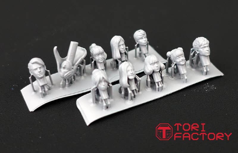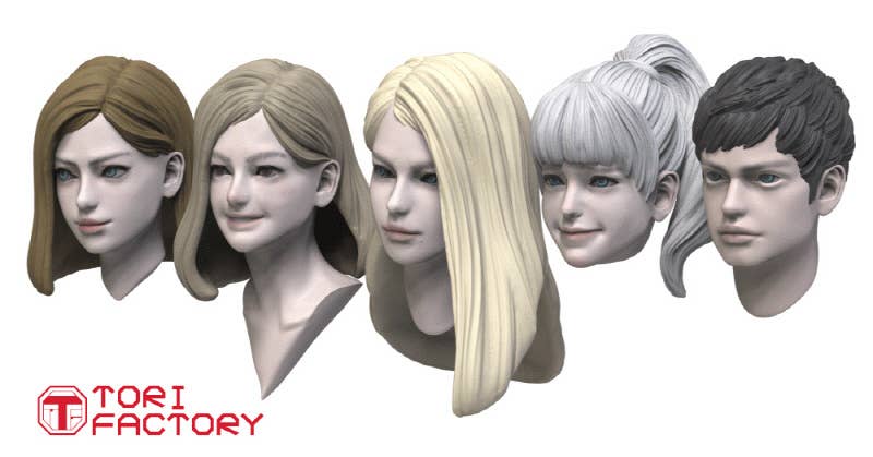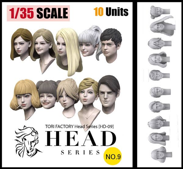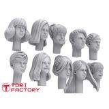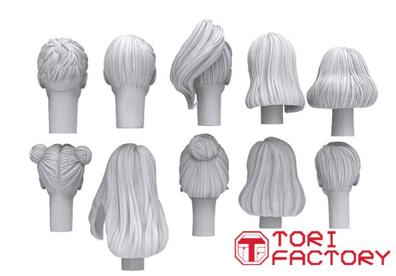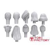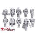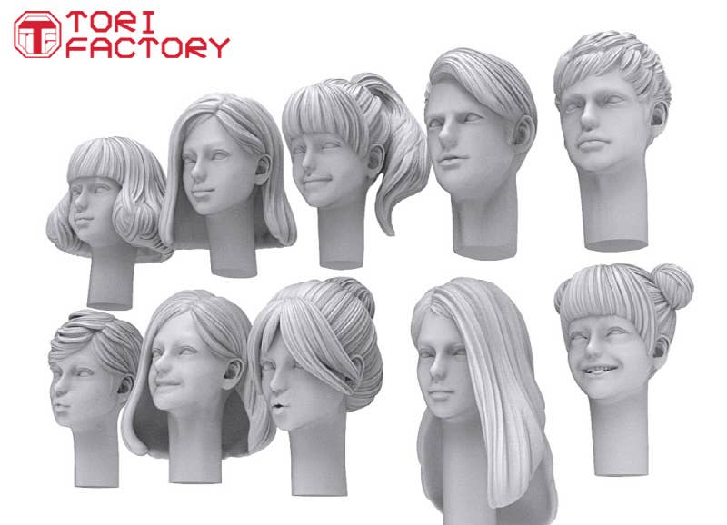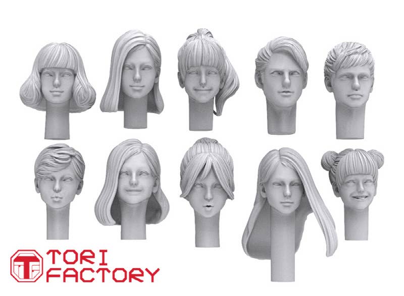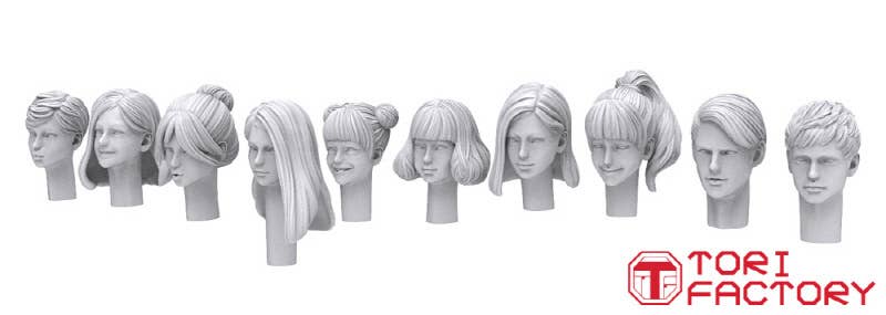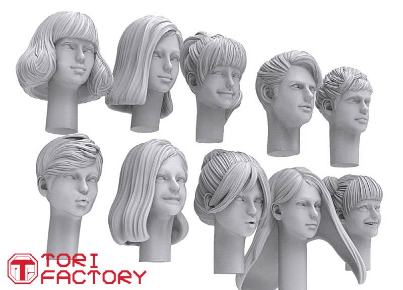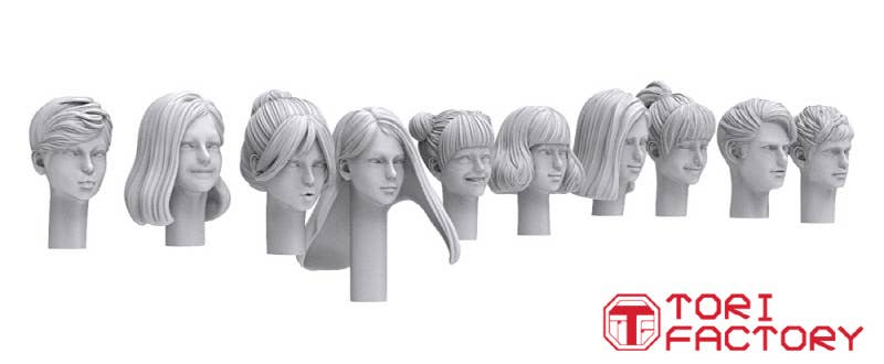This 10-piece spare head set includes 8 types of female spare heads and 2 types of male spare heads, all with modern hairstyles.