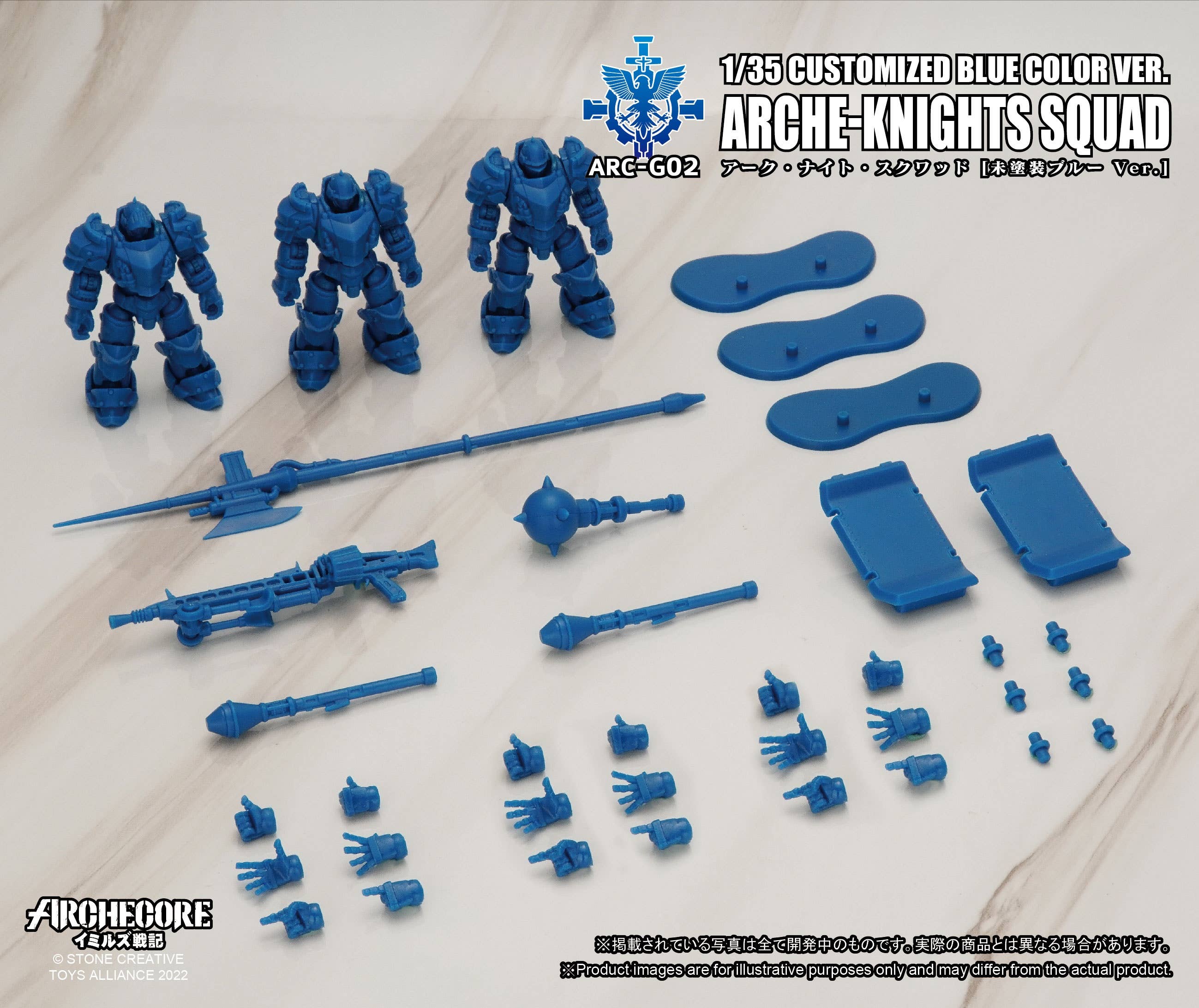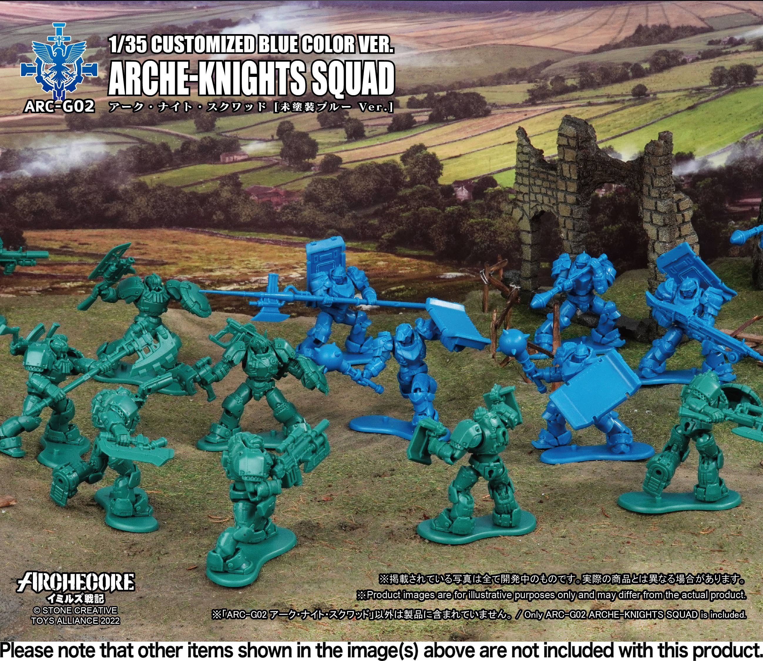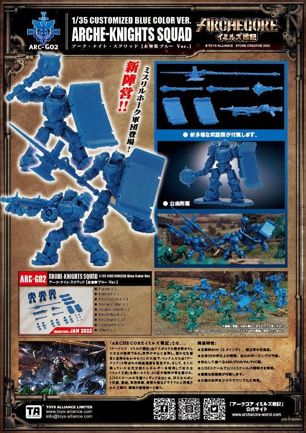 The newest member of Toys Alliance Unlimited's "Archecore -Saga of Ymirus" lineup is the Arche-Knight Squad in an unpainted blue color! These figures can be left as they are, or they can be painted any combination of colors you like to create your own squad of unique futuristic knights. You'll get three knight figures, along with an assortment of weapons and accessories. Place your order today!