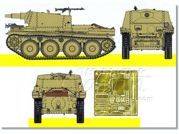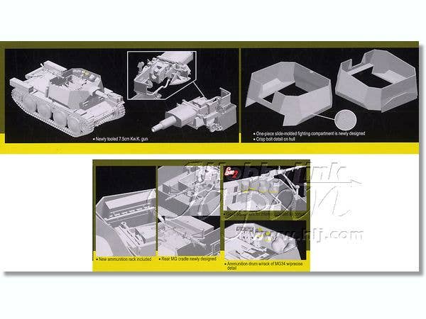 Here's a new-generation kit from Dragon, another in their "Smart Kit" series of high-detail, low-hassle kits featuring clever engineering and employing the latest in slide-mold technology to achieve the highest level of detail with the lowest number of parts. The philosophy here is "work smarter, not harder," catering to the OOTB modeler who wants a high fidelity of detail and accuracy without having to make a ton of modifications along the way. The kit still includes plenty of parts, to be sure, but the clever engineering means modelers will face fewer hurdles getting them all together. The easy-to-assemble individual link Magic Tracks are already cleaned up and are ready to be assembled, and feature accurate casting number detail on each link. Two frets of photo-etched detail parts are included, as are clear parts for the vision blocks. Also includes interior parts, a big plus since this is an open-topped vehicle. Decal options are for one vehicle. An excellent kit of an interesting vehicle, another great entry in the 38(t) series from Dragon!