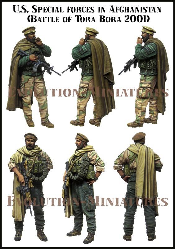 In retaliation for the 9/11 terrorist attacks, the United States invaded Afghanistan in October of that year, and in December, U.S. Special Forces expanded into the eastern part of the country in an attempt to detain mastermind Osama bin Laden. This became known as the Battle of Tora Bora. Evolution Miniatures brings us a set of two unpainted, unassembled U.S. Special Forces soldiers who participated in this battle. Each of them wears an Afghanistan-specific outfit so they can blend in with the locals. Order yours today!