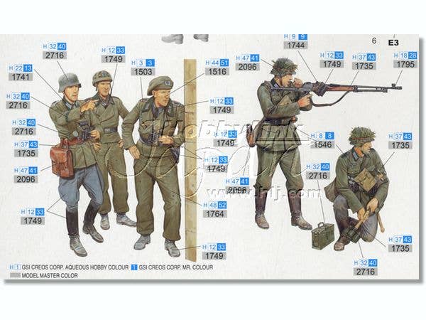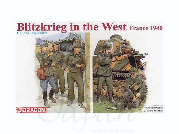 A set of five finely sculpted and molded German soldiers, Blitzkrieging in the West, somewhere in France around 1940. Of particular interest are the early-war beret and tankers helmet worn by some of the figures. Includes weapons and accessories, as illustrated below.