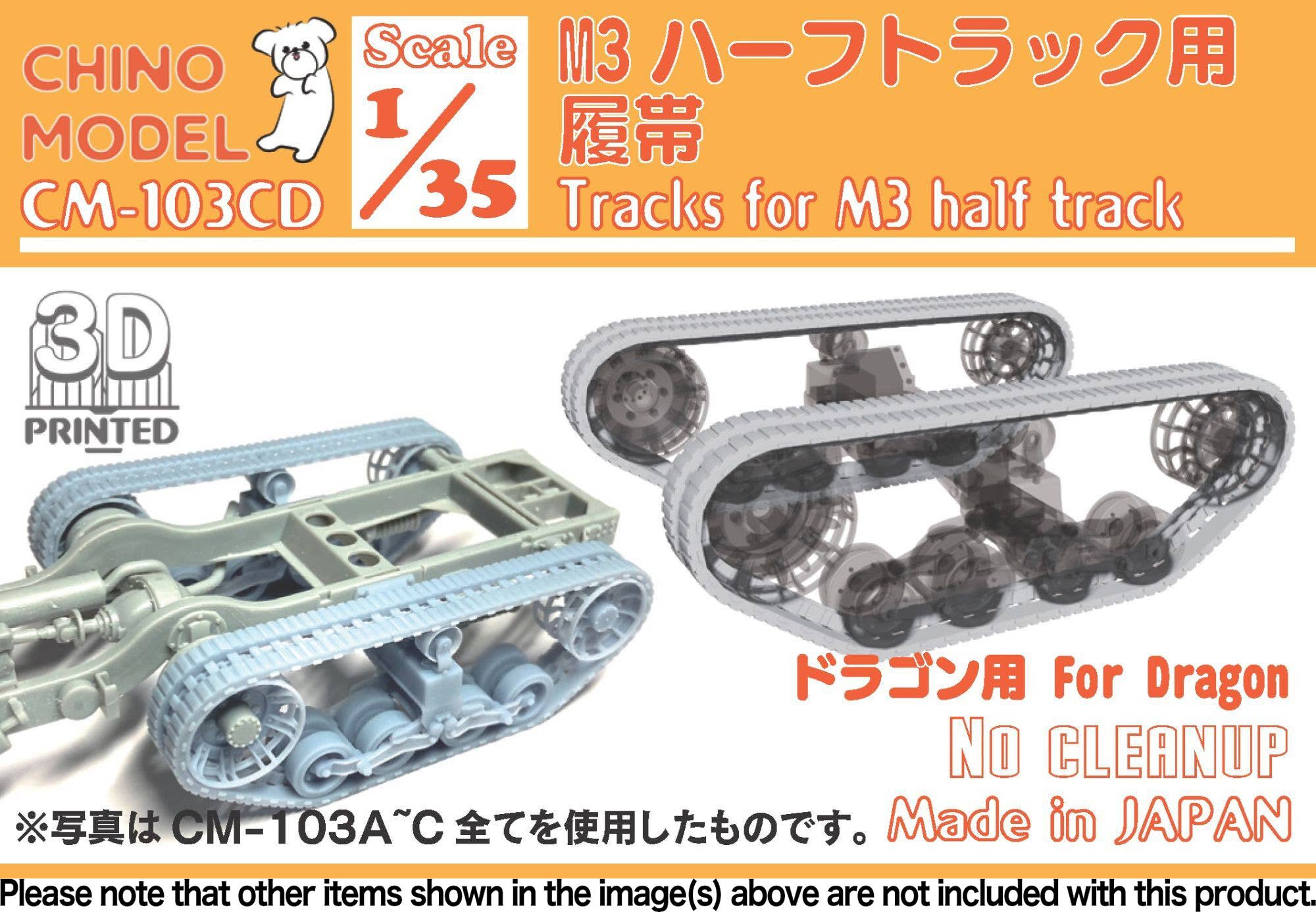 CM-103A features a set of starting wheels and guide wheels, with complex shapes faithfully reproduced in one-piece molding. For easy assembly, CM-103B offers a suspension set with several large pieces molded as a single unit. CM-103C presents a crawler set with comprehensive one-piece molding all around. Please note that there are two types available for each kit (D: for Dragon (this product), T: for Tamiya) due to a slight overall length difference of approximately 2mm between the two brands. Please exercise caution when making a purchase.