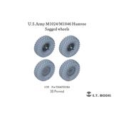 3D-printed detail-up parts reproducing the wheels of the U.S. Army M1024/M1046 Humvee. Compatible with Tamiya kits. The self-weight deformable tires accurately model the tread pattern and manufacturer markings on the sidewalls.