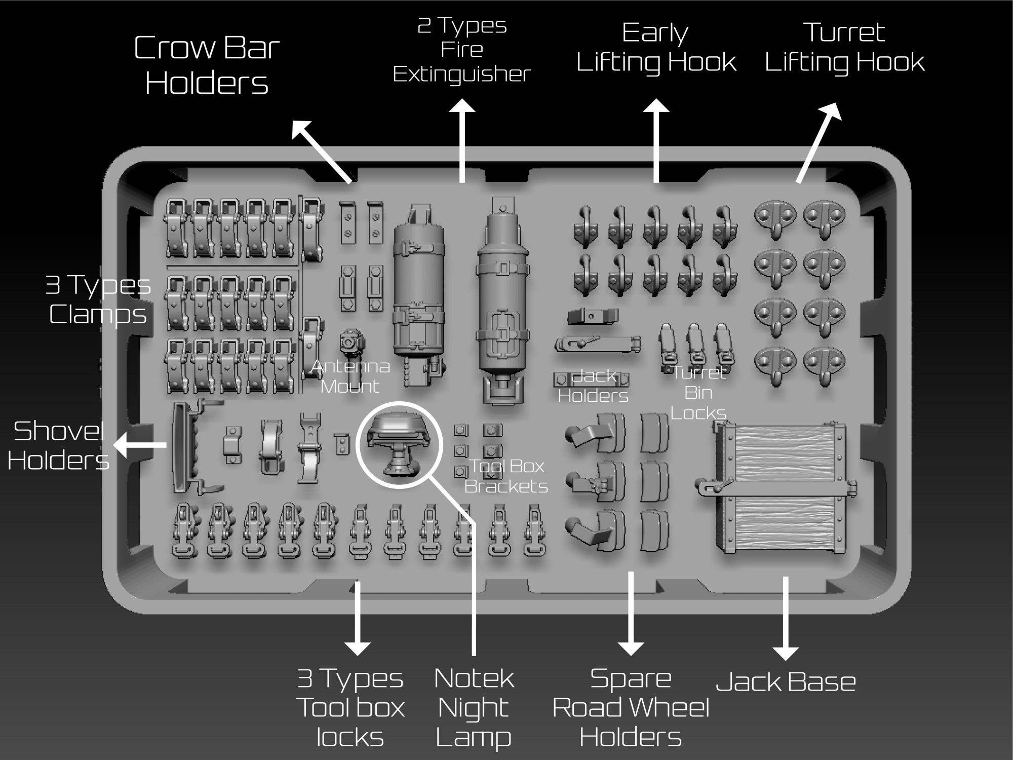 This is a 3D-printed detail parts set designed to replicate the various exterior equipment of the German Panzer II tanks during World War II with precision and accuracy. The set includes clamps, smoke dischargers, fire extinguishers, towing cable holders, and more, each faithfully recreated through 3D printing. Specifications may vary depending on the tank model and variant, so we recommend referencing actual vehicle photographs for installation.