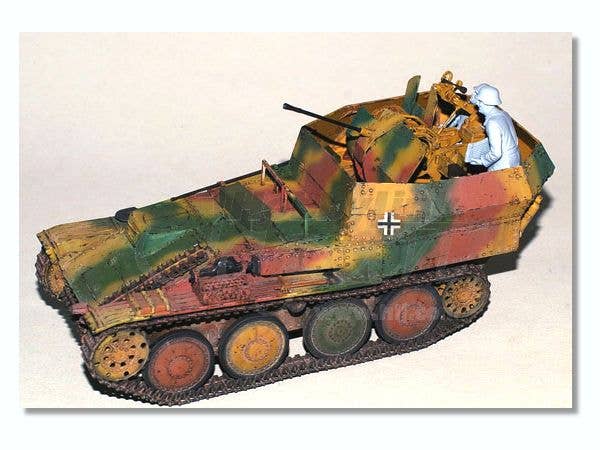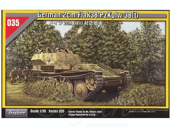 Just like the Germans did in WWII, Tristar has created a 2cm Flak 38(t) Sd.Kfz. 140 from the stalwart Czechoslovakian Panzer 38(t) chassis. Featuring sharp detail and fine molding throughout, the kit includes photo-etched metal detail parts, indy-link tracks, complete interior, and markings for two vehicles. As a nice touch, the tires are molded separately from the wheels to facilitate painting. For those of you who can read Japanese: Although the boxtop says the figures included may differ from those depicted in the box art, there are in fact no figures included in this kit at all. Well, I suppose that certainly does "differ" from what's shown!