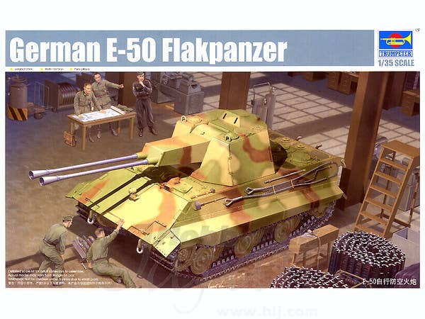 Trumpeter's E-50 Flakpanzer kit is sharply molded in light gray plastic, and features flexible belt-style tracks. Comes with a nice fret of photo-etched metal detail parts, braided metal wire for the tow cables, and a painting chart for a fictitious operational vehicle. No markings are included (none needed!). Another great "what-if" project from Trumpeter!