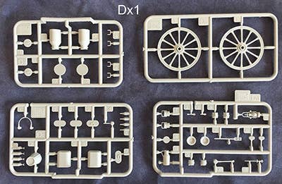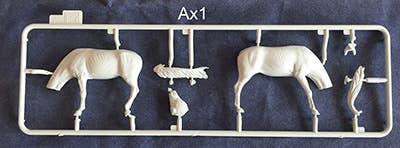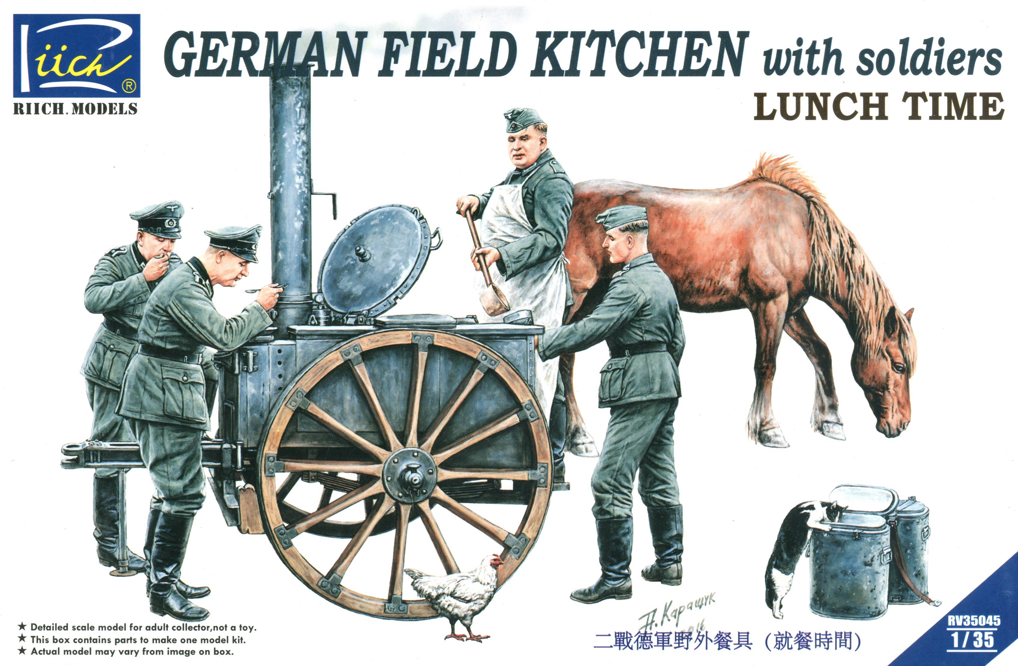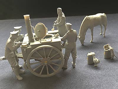 This kit includes parts to build the field kitchen, three soldiers taking a lunch break, a very well-fed cook, and a grazing horse also on his lunch hour. Also includes food containers and a cat getting into one of them. Photo-etch parts are included!
