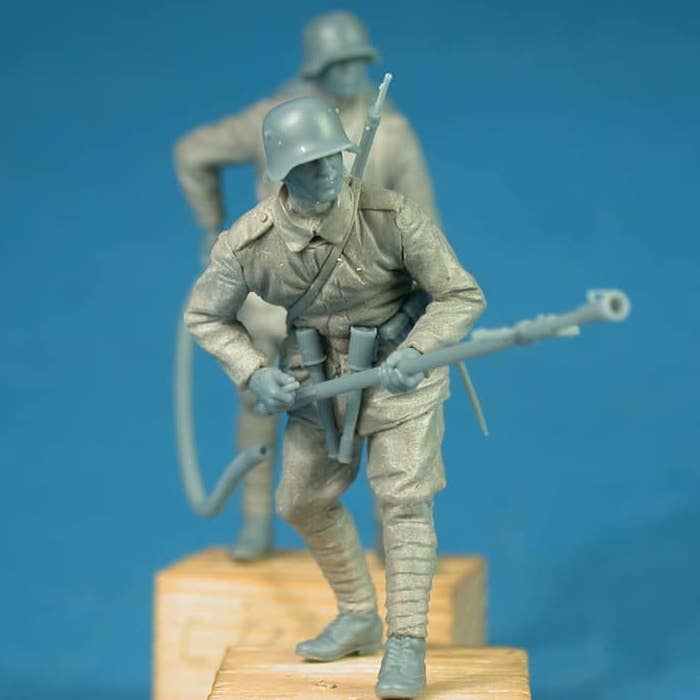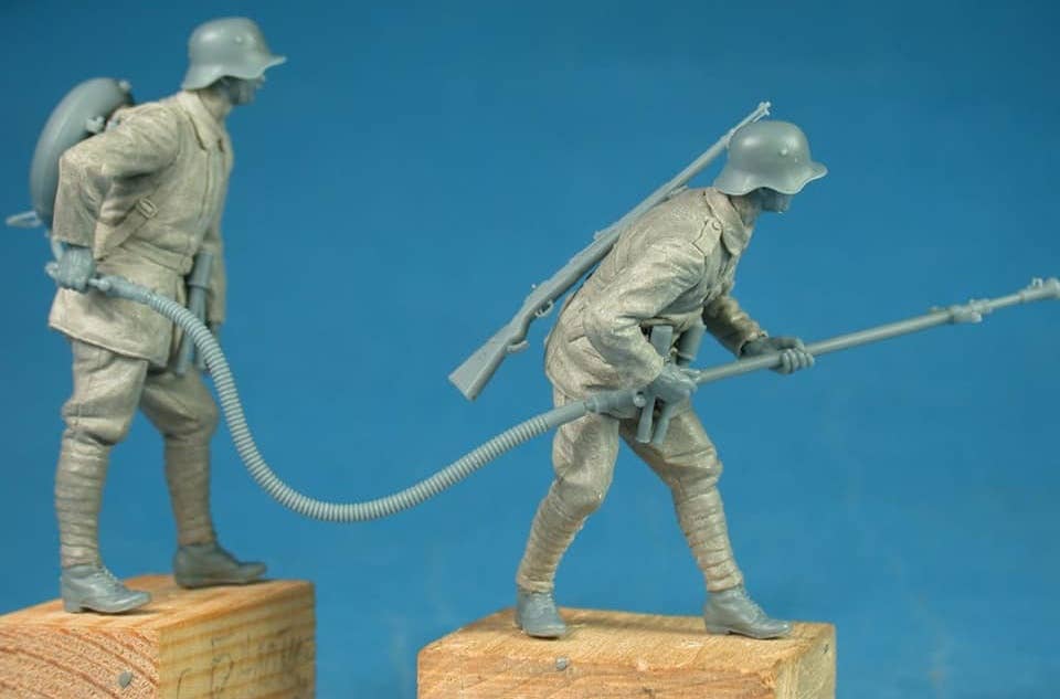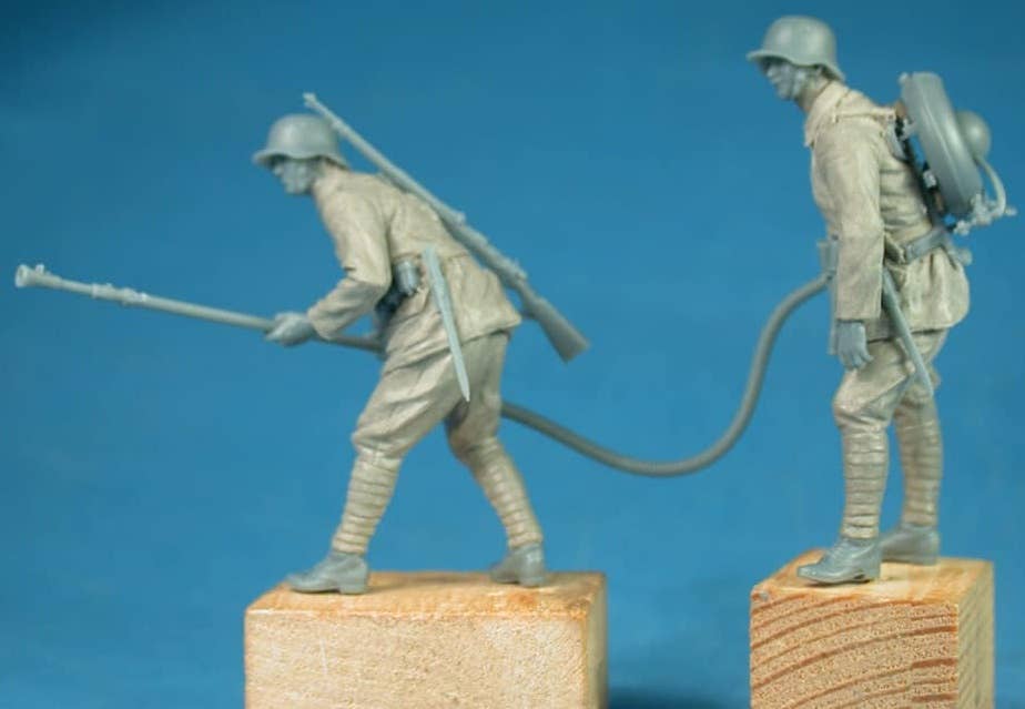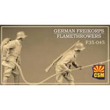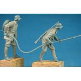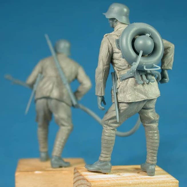 This unpainted, unassembled resin figure set of two German Freikorps flamethrower squad members includes one soldier carrying the flamethrower in a crouched position, and the second one following behind with the fuel tank on his back. (The bases shown are not included.) Order them for your own collection today!