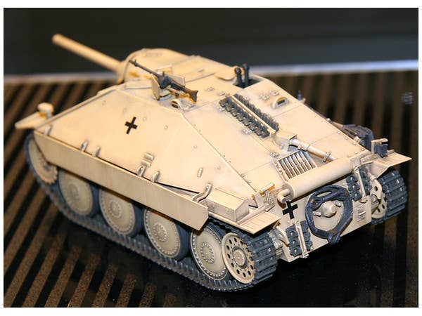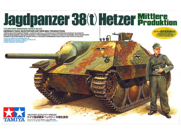 Tamiya has finally released a 1/35-scale kit of the WWII German Jagdpanzer 38(t) "Hetzer" tank destroyer! This all-new kit represents a mid-production vehicle. Road wheels are well detailed on both sides, and tracks are provided as both flexible belt and injection-molded link-and-length types. Molding is Tamiya standard, meaning very sharp and very clean, with excellent fit making assembly a breeze. Includes one figure and decals for four versions.