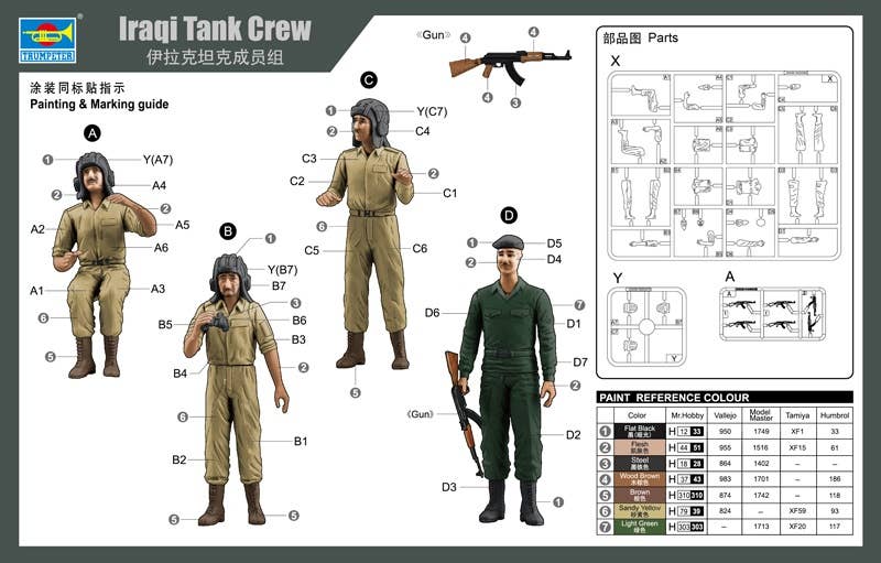Add realism to your models with this 1/35 scale Iraqi Tank Crew set from Trumpeter. The kit includes the makings for 4 figures and has 6 Rifles. One figure can be posed in a sitting or standing position. There are 4 torsos, 4 sets of arms and legs, 4 heads, 3 helmets and 1 hat. Order today!