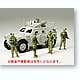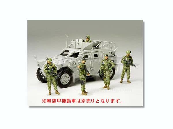 The JGSDF infantry has recently begun to appear frequently in the media. This kit depicts men in the latest style of uniform and equipment which have been deployed in Iraq in the cause of humanitarian assistance. The basic battle dress is the tropical type. Over it every figure wears the new body armor with lots of loop riggings on the front and back. The modular pouches, magazine pouch, radio pouch etc., can be attached to these loops. Reflecting the special nature of the mission in Iraq, the kit contains a dose meter as well. One of the figures (the MG gunner) can be put into the turret of the JGSDF Light Armored Vehicle (TAM35275). In addition to the basic Type 89 rifles and a MINIMI machine gun, a Panzerfaust 3 (110mm rocket launcher) is included. Decals for the national insignias are included, too. Very useful figures for your diorama!