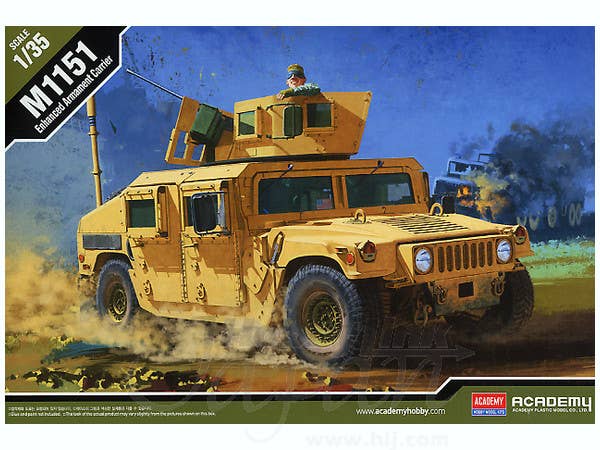 Academy's detailed kit of the M1151 Enhanced Armament Carrier features "new-style" injection molded tires (molded in black, and in halves), positionable doors, and two crew figures. Also includes photo-etched metal detail parts.