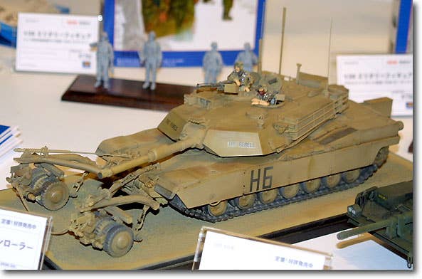 The M1A1 HA(=Heavy Armor) is the fortified armor (with depleted uranium armor) version of the US M1A1 Abrams MBT, deployed just before the onset of the Gulf War in 1991. Trumpeter's M1A 1 series are of their original design; some say Trumpeter's version have the most accurate dimensions. This kit depicts the variation with the Anti Mine Roller attachment which makes a corridor through a mine field. This type of tank usually works with the M1A1with Mine Prow (also modelized by Tamiya as TAM35158 and Trumpeter as TRP00335). The kit also contains the complicated bracket and the safety route-indicating flag setter on the rear. Trumpeter knows the hearts and minds of AFV modelers very well. They have included the simulator device for the exercise and some containers for the tank crew. You can choose the tracks from the rubber band type or injection plastic track links.