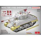 Rye Field Model's 1/35-scale model kit of the M4A3 76W VVSS Sherman (late updated version) features tracks that can be connected, and are movable after assembly, as well as workable torsion bars! Also includes two frets of photo-etched parts, decals for five versions, a metal gun barrel, and a 3D-printed muzzle brake. This updated version also features photo-etched parts with fenders and more, as well as 3D-printed parts for the M2 heavy machine gun's main body and box magazine, the front machine gun barrel, a pair of jerry cans, a tag eye, a traveling lock, and more. The hatches can also be built opened or closed. Place your order today!