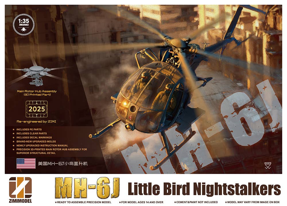 ZimiModel's 1/35-scale model kit of the AH-6J Little Bird Nightstalkers comes with the main rotor hub reproduced with 3D-printed parts for superior detail, photo-etched parts, clear parts, and decals. Place your order today!