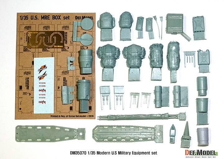 This set includes 42 parts to build the modern U.S. military equipment such as bags, boxes, and buckets shown above. Includes decals, photo-etched parts, and one sheet of MRE boxes to fold into shape.