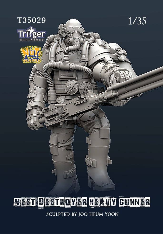 Zombies and mutants beware! Nuts Planet brings us a highly detailed unpainted resin figure kit of the Nest Destroyer Heavy Gunner! In his heavy protective suit, he hefts his massive M2 heavy machine gun, equipped with a power loader, with great confidence. You definitely want this guy on your side! Order him for your own post-apocalyptic diorama today!