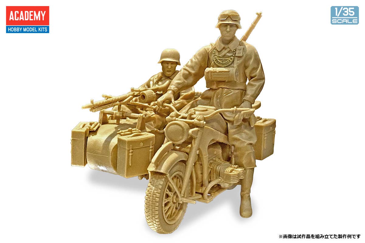 Academy brings us a completely newly molded model kit of the Panzer I Type B, which was adopted by the German Army at the beginning of World War II! The Panzer I Type B was equipped with a water-cooled engine and had a modified suspension. This model kit has a moderate number of parts, and is precisely molded for accuracy. The set includes a tank commander figure with two different heads to choose from, a muffler cover at the rear of the hull, photo-etched marking plates for troops, and a synthetic fiber tow rope. In addition, a completely new-mold Zundapp KS750 motorbike with a sidecar, two figures of German field military police, and decals for five versions are included. Place your order today!