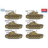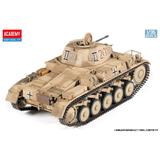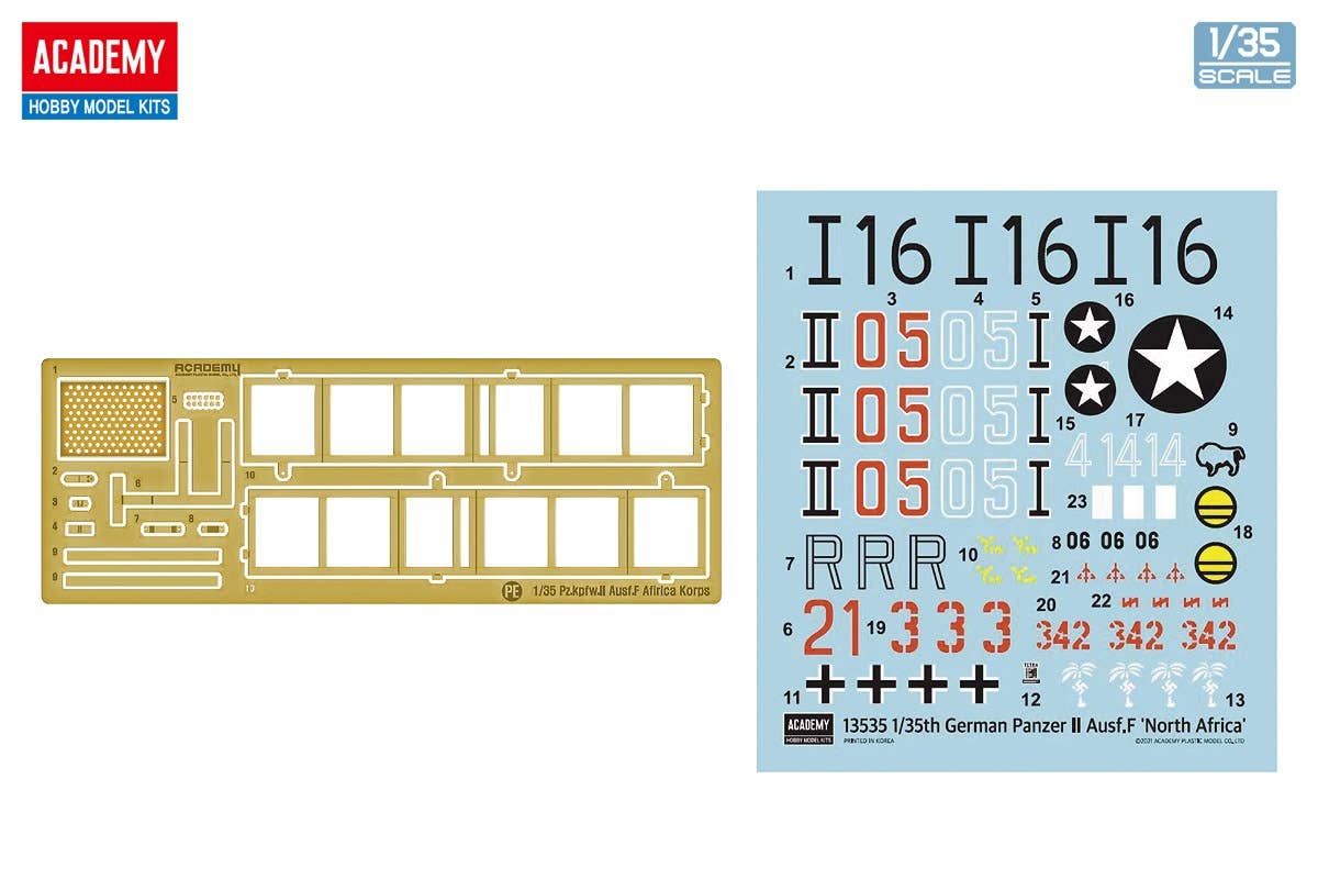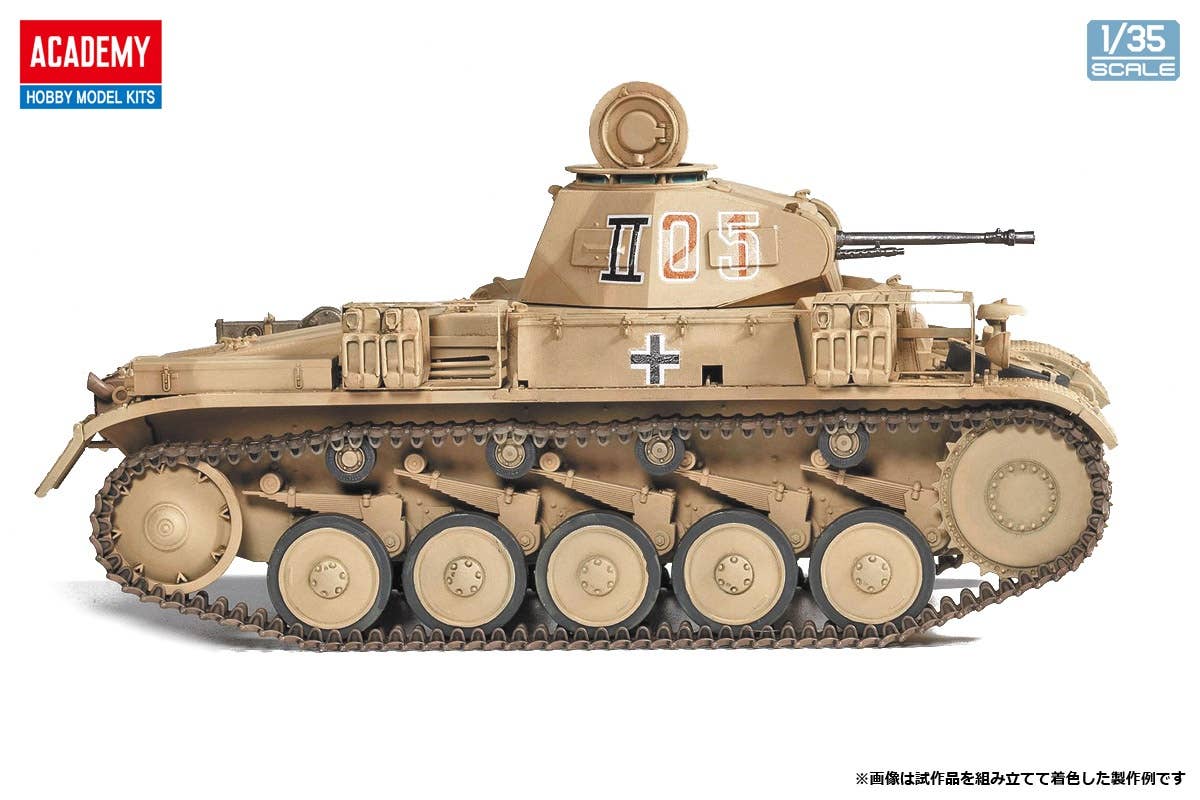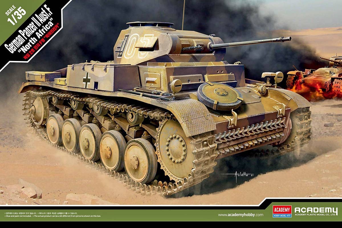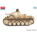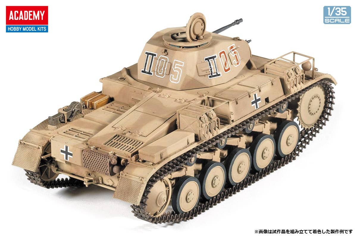 This kit from Academy is a completely new mold! The Panzer F II type was adopted by the German Army at the beginning of World War II. This kit reproduces the type with enhanced armor thickness, the 55-caliber 20mm machine gun and the MG34 machine gun. A moderate number of parts allows the rugged form of the tank to be precisely expressed. Photo-etched parts and decals for six versions, centered on the 15th Panzer Division from the North African Campaign, are included. Order yours now!