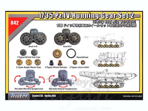 Tristar's highly detailed set of running gear parts for early and mid-production versions of the German Panzer IV tank and variants, as shown here. No indication is given as to how many full suspensions can be made from this set, but there are an awful lot of parts in the box! Optional sprockets and idlers are also included. Tracks and vehicles not included.