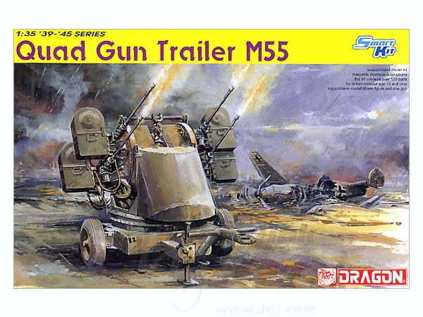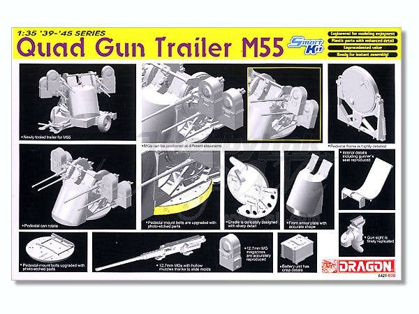 Dragon has released the .50 caliber quad gun mount from its M16 Multiple Gn Motor Carriage kit as this stand-alone version, the Quad Gun Trailer M55. The gun mount itself is from the M16 kit, but the trailer is an all-new tooling. This is one of Dragon's "Smart Kits," designed to offer maximum detail with minimum hassle. The molding is sharp and detailed, with the .50 caliber guns featuring hollow muzzles. The pedestal can rotate, and the guns can be positioned at different elevations. Includes a photo-etched metal pedestal mount, a seated figure in firing position, and markings for two variations.