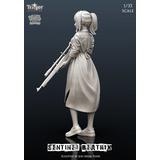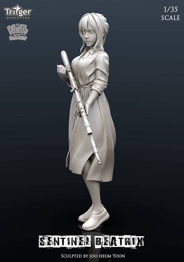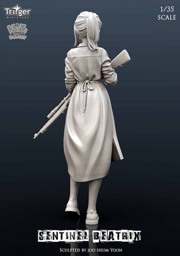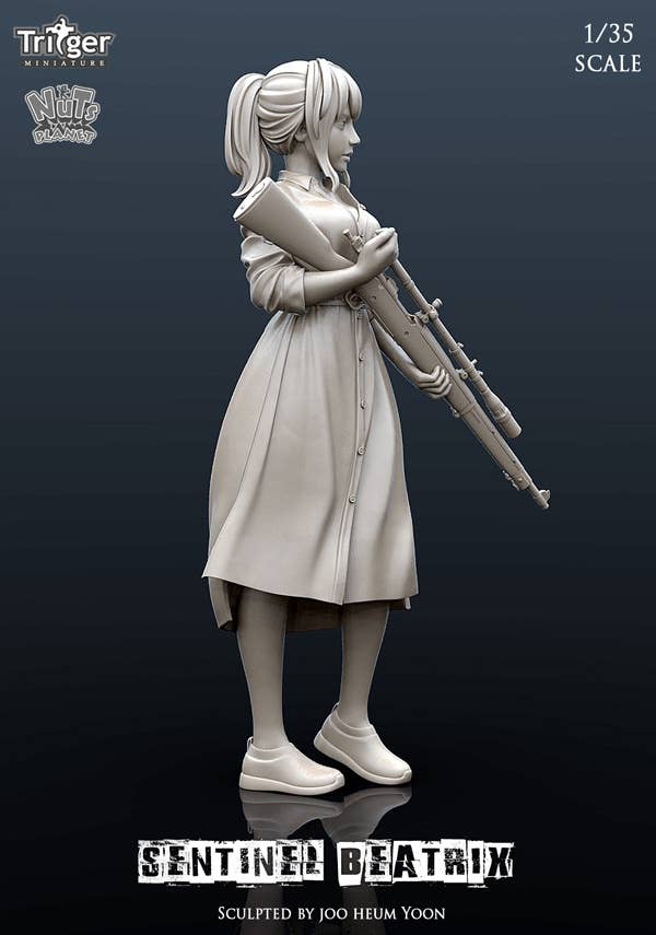 Sentinel Beatrix is the latest in Nuts Planet's lineup of unpainted resin girls-with-guns figures! In civilian clothing and shoes, she's evidently just heard something nearby, and is on the alert; she carries a rifle with a large optical scope. Paint and finish her any way you like, and give her a backstory -- order yours today!