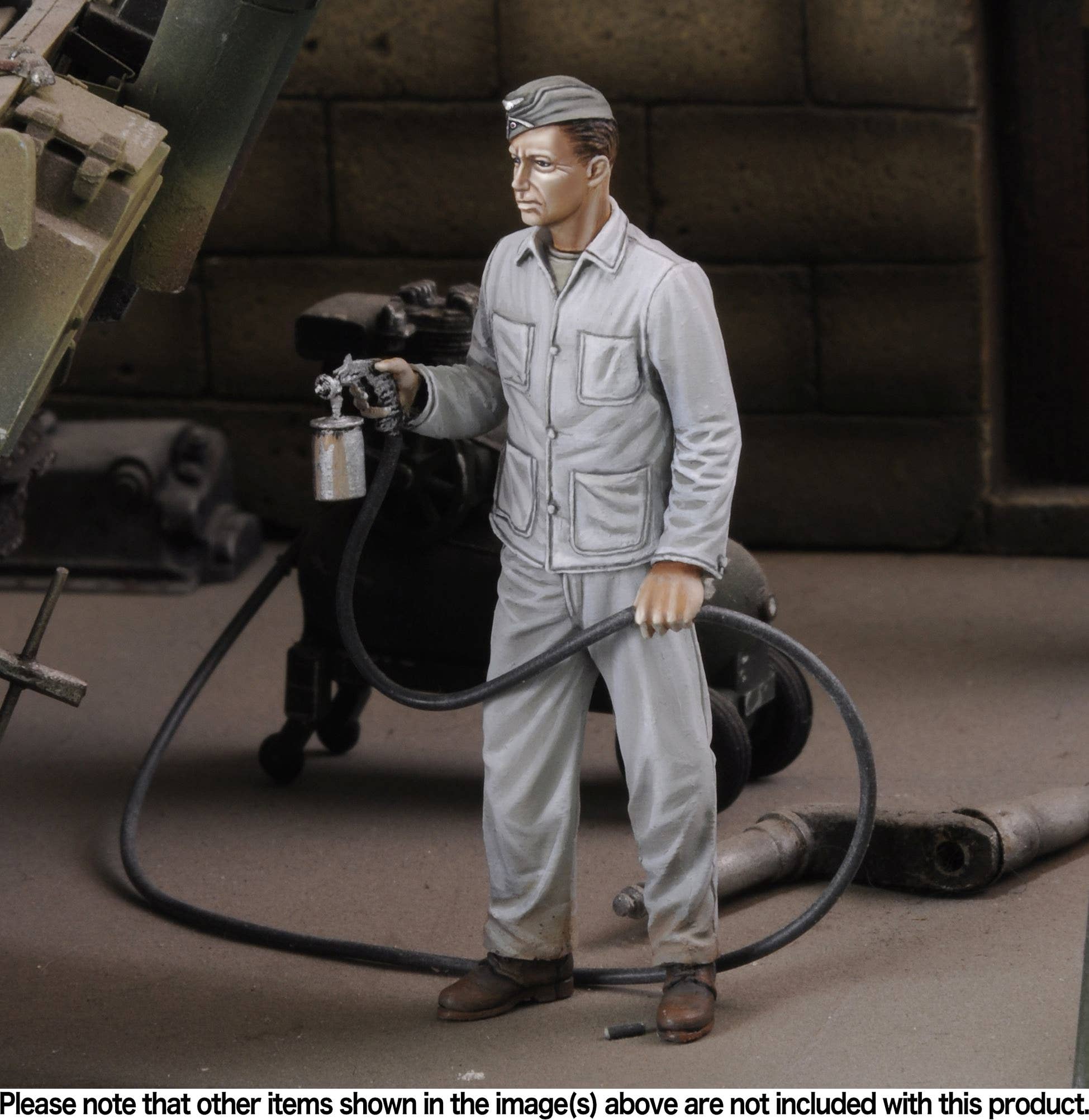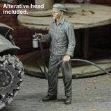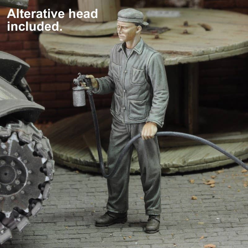 A 1/35 scale resin figure kit of a soldier spray painting, posed with a hose and canister in hand. Includes an alternate head.