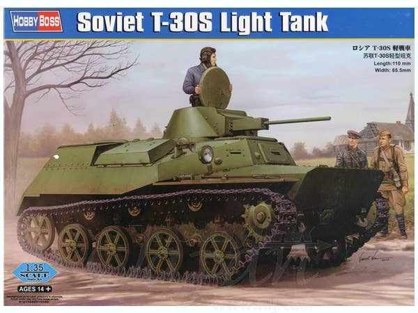 1/35 scale Russian T-30S Light Tank by Hobby Boss. Consists of over 300 parts, and 38 photo-etched parts. Also includes copper cable, metal barrel, and a decal sheet for vehicle numbers.