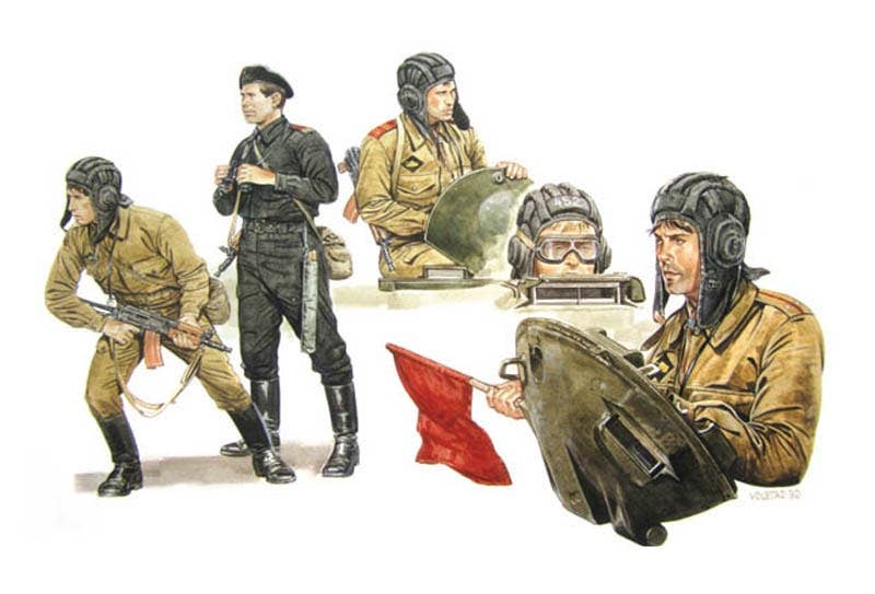 Includes parts for three full and two half-figures. Also includes accessories such as a respirator case (current type), a signal flag case, standard Soviet goggles and a Soviet AFV helmet.